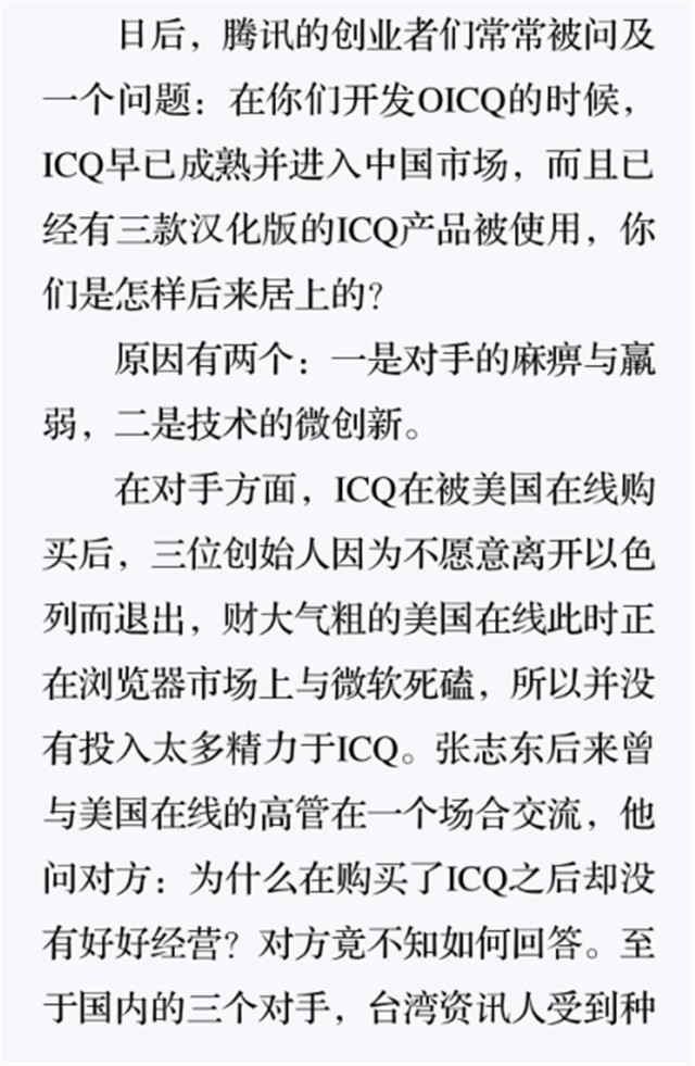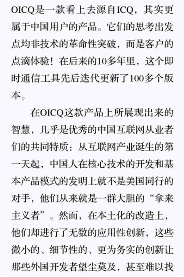 深读之后发明,着实全书真正的焦点在于透过腾讯可以视察到的中国企业逻辑,其中许多基于国情而降生的特殊能力,已往或受诟病或被追捧,而本书作者可以以越发客观的姿态对其举行剖析,这无疑是一种今世创业者和企业家应当学习的姿态和能力。
