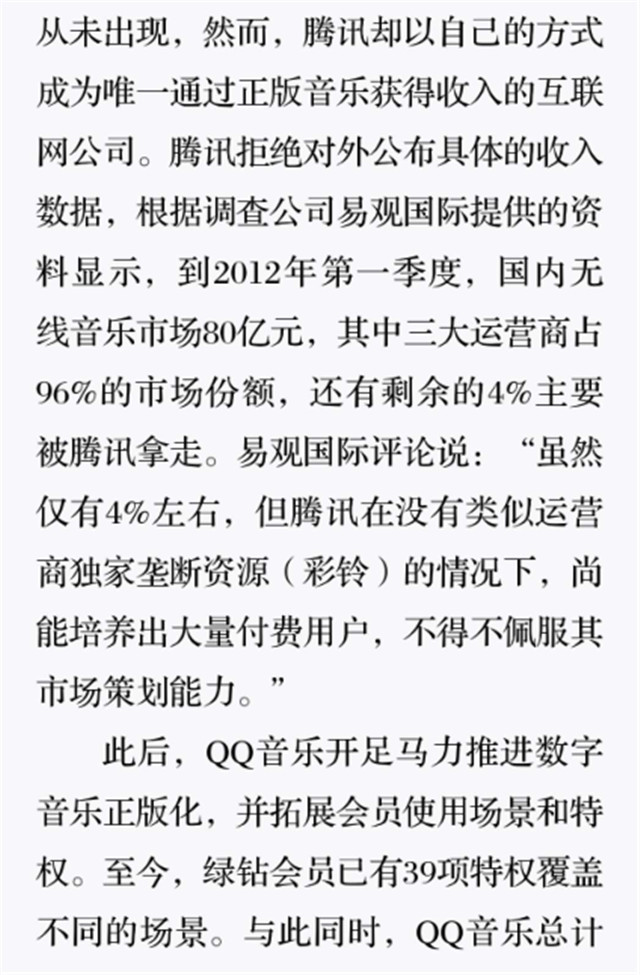 深读之后发明 ,着实全书真正的焦点在于透过腾讯可以视察到的中国企业逻辑 ,其中许多基于国情而降生的特殊能力 ,已往或受诟病或被追捧 ,而本书作者可以以越发客观的姿态对其举行剖析 ,这无疑是一种今世创业者和企业家应当学习的姿态和能力 。